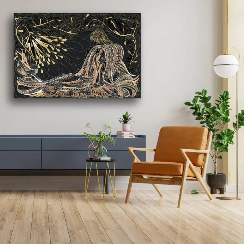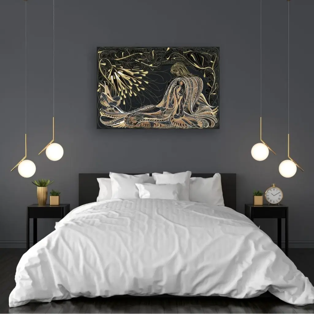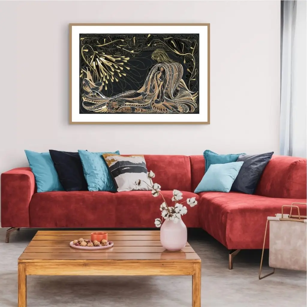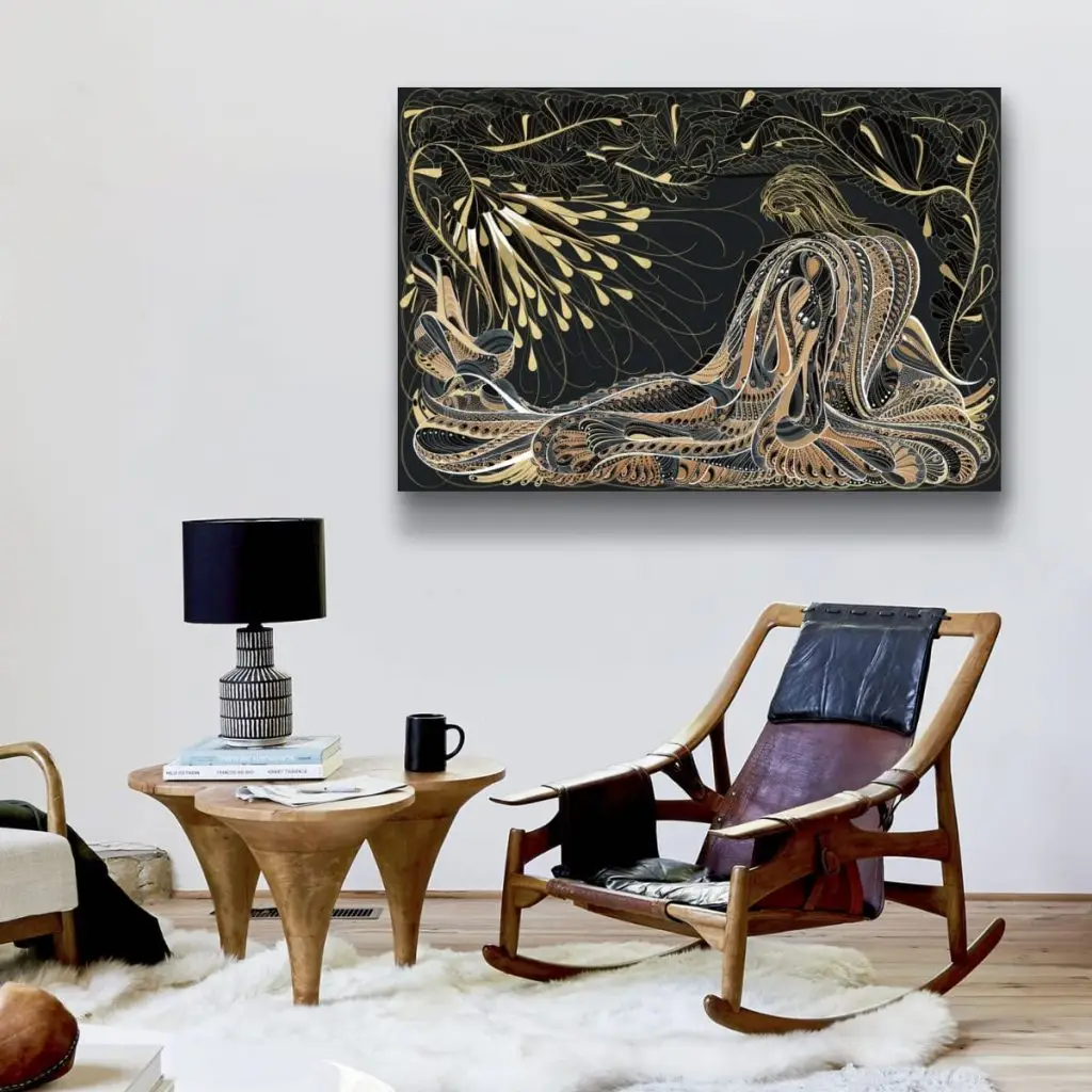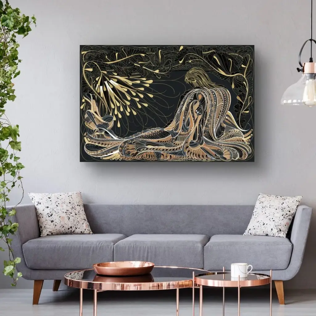 This pen and ink illustration features a stylised, contemplative figure enveloped in flowing, intricate lines and patterns, with gold and earthy tones that evoke a sense of harmony and tranquility. The composition is both ornate and serene, making it a captivating visual experience.